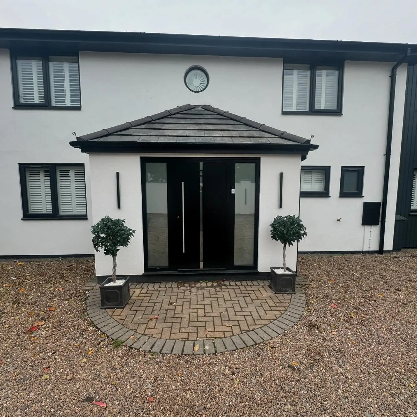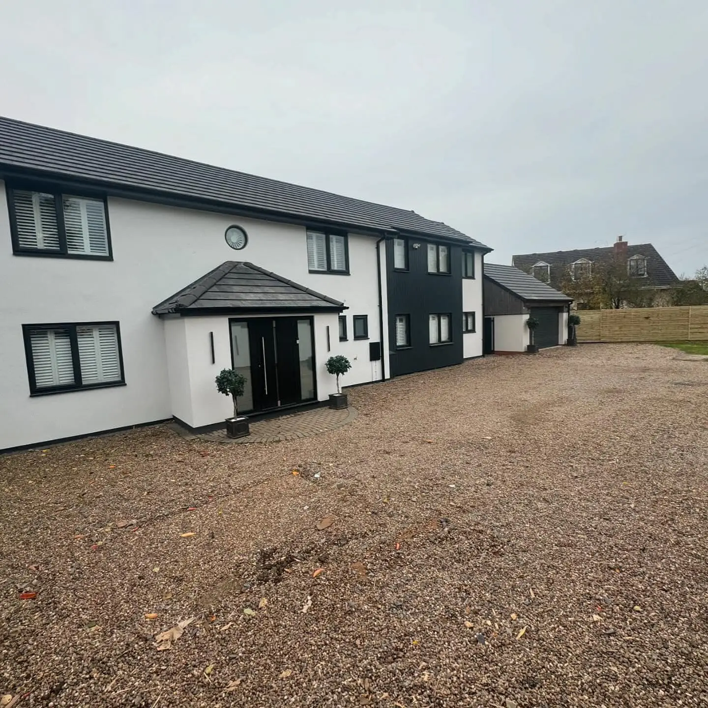 - A custom-built step was constructed near the front door using matching materials, ensuring a consistent, modern aesthetic.