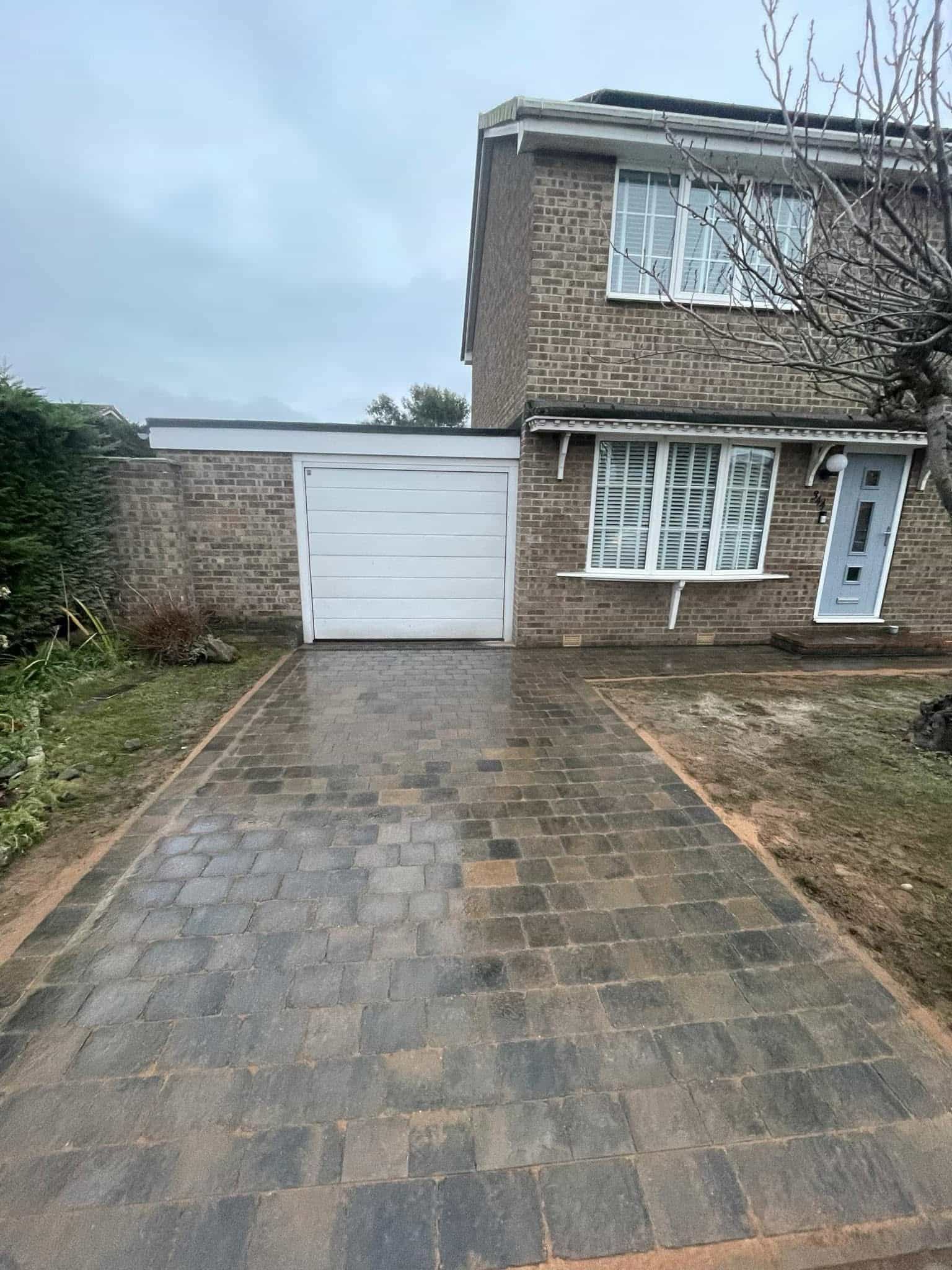 The project involved transforming the front of the house, the garage entrance, and the driveway with high-quality Sorrento block paving.